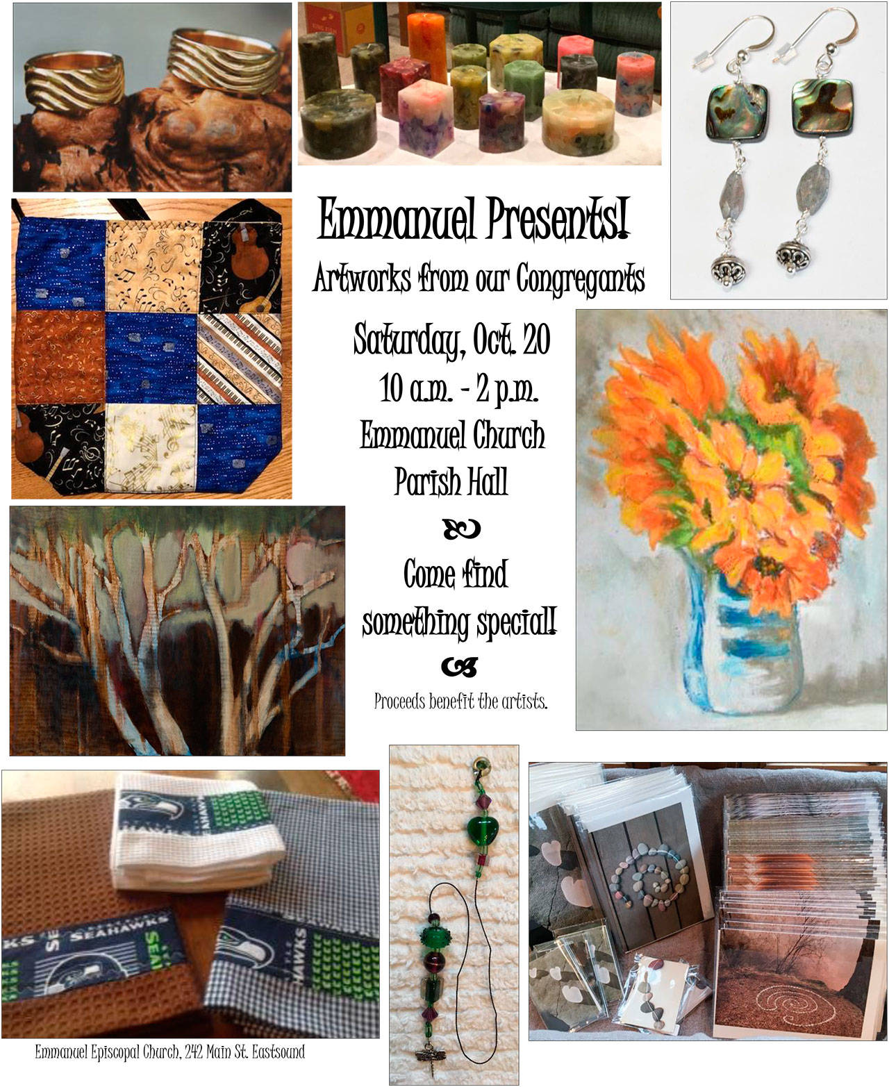 Emmanuel Episcopal Parish will feature the work of its parishioners on Oct. 20 from 10 a.m. to 2 p.m. Peruse paintings, jewelry, candles, quilted items, stationery and more. All proceeds will benefit the artists. Demonstrations of jewelry making and how to paint with watercolors will also be exhibited.
