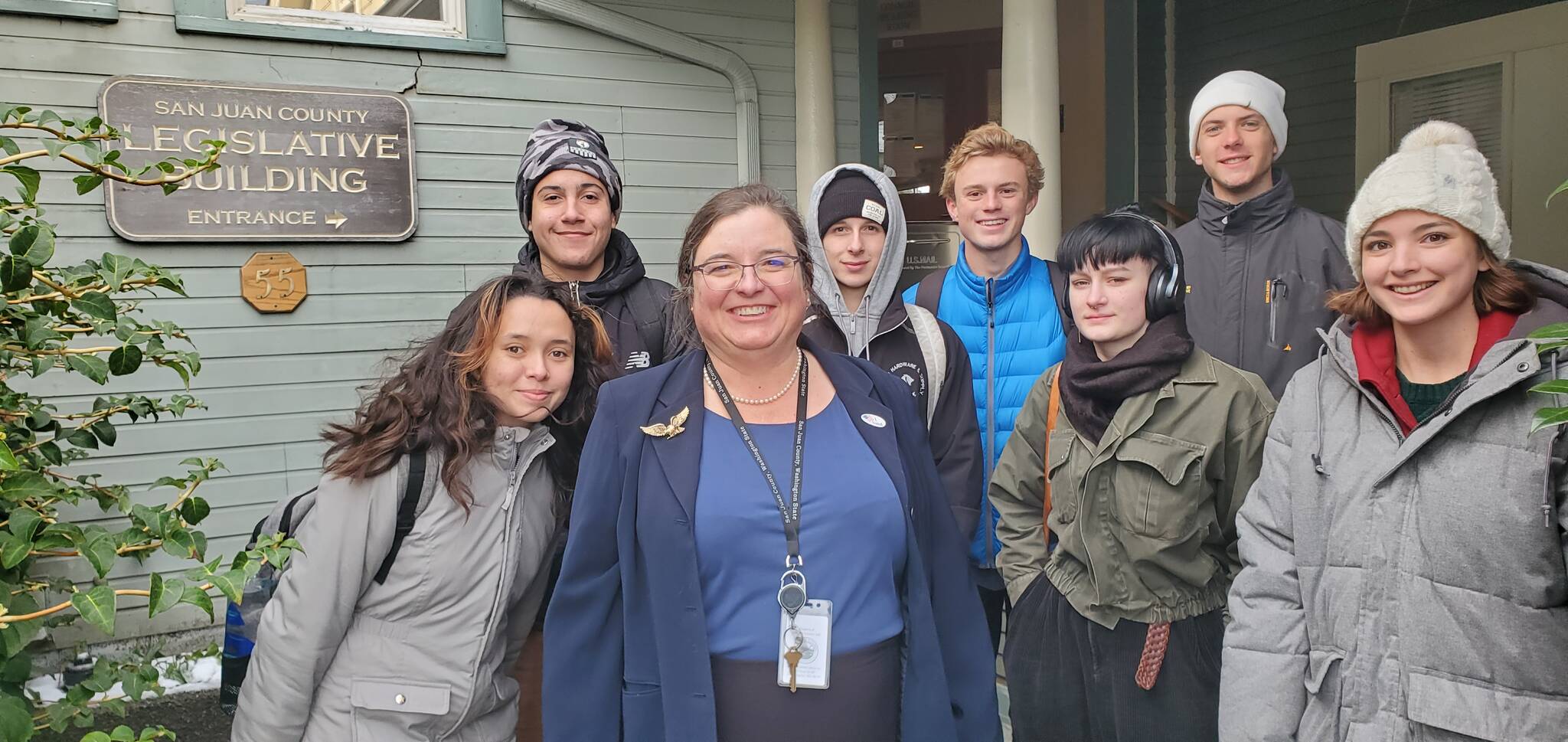 our faces as we entered the car deck. Four layers of jackets and a fluffy hat were no match for the first cold snap of the season. Why would seven Orcas Christian high school students choose that chilly Tuesday morning in November to take a walk in Friday Harbor? It was Election Day, and we had the privilege of observing our local government in action. Led by our government teacher, Mr. Rivera, we headed up the hill to meet up with Cindy Wolf and attend a San Juan County Council meeting.