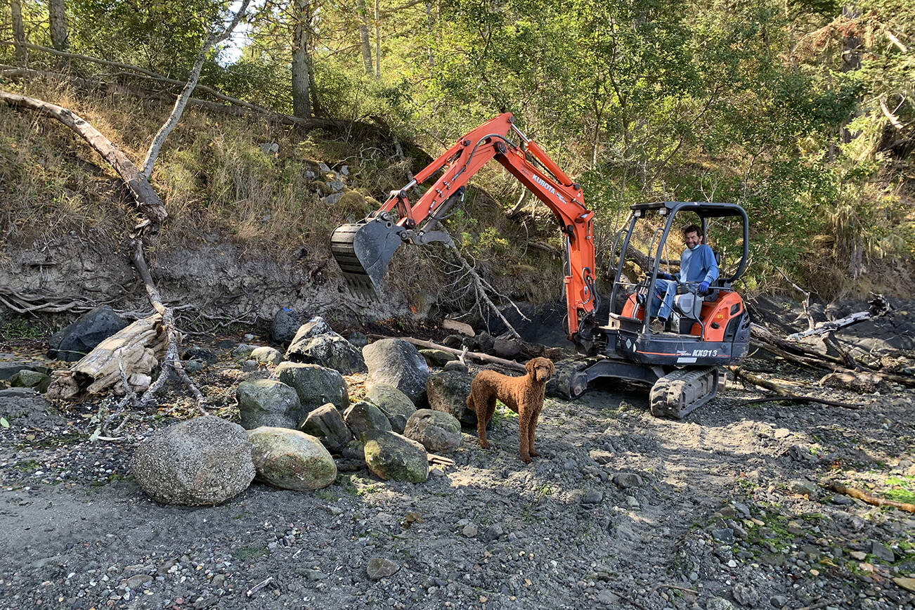 Michael Budnick, of Northwest Concepts, implemented the project, which was designed by Coastal Geologic Services. Approximately 42 cubic yards of medium to large boulders along with four large toxic creosote logs were removed from the upper beach, along the forage fish spawning habitat zone. Last winter, to complement recent beach restoration actions, Flower Mountain Tree Service planted 220 native trees and shrubs along the shoreline. Restoration efforts were supported by a grant from the Washington State Salmon Recovery Funding Board and the Salmon Point Community Association.