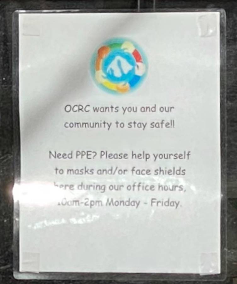 Megan Ehrmantraut, Community Support Assistant at OCRC ,had this to say: “If you are a client of OCRC, please feel free to stop by during the above office hours for our Coffee Care service. We offer hot coffee and tea or oatmeal if you find yourself in need of a warm-up. We look forward to seeing familiar faces again soon!” Meg can often be found in OCRC’s new front office space, answering phones, assisting community members in need with their intake process, and helping clients at the new walk-up window service. Baskets of PPE and winter gloves are placed on the front window shelf. Stop by and pick some up if you are in need!