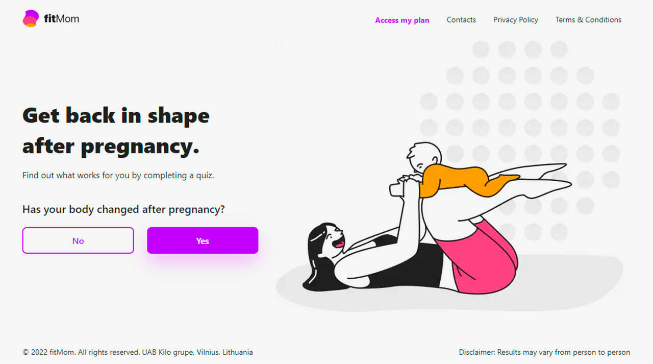 fitMom workout plan considers the current health of the new mom to prevent injuries. The 2-minute quiz helps the developers create a fat loss and fitness program that enables new moms to reach their goals without hassles.