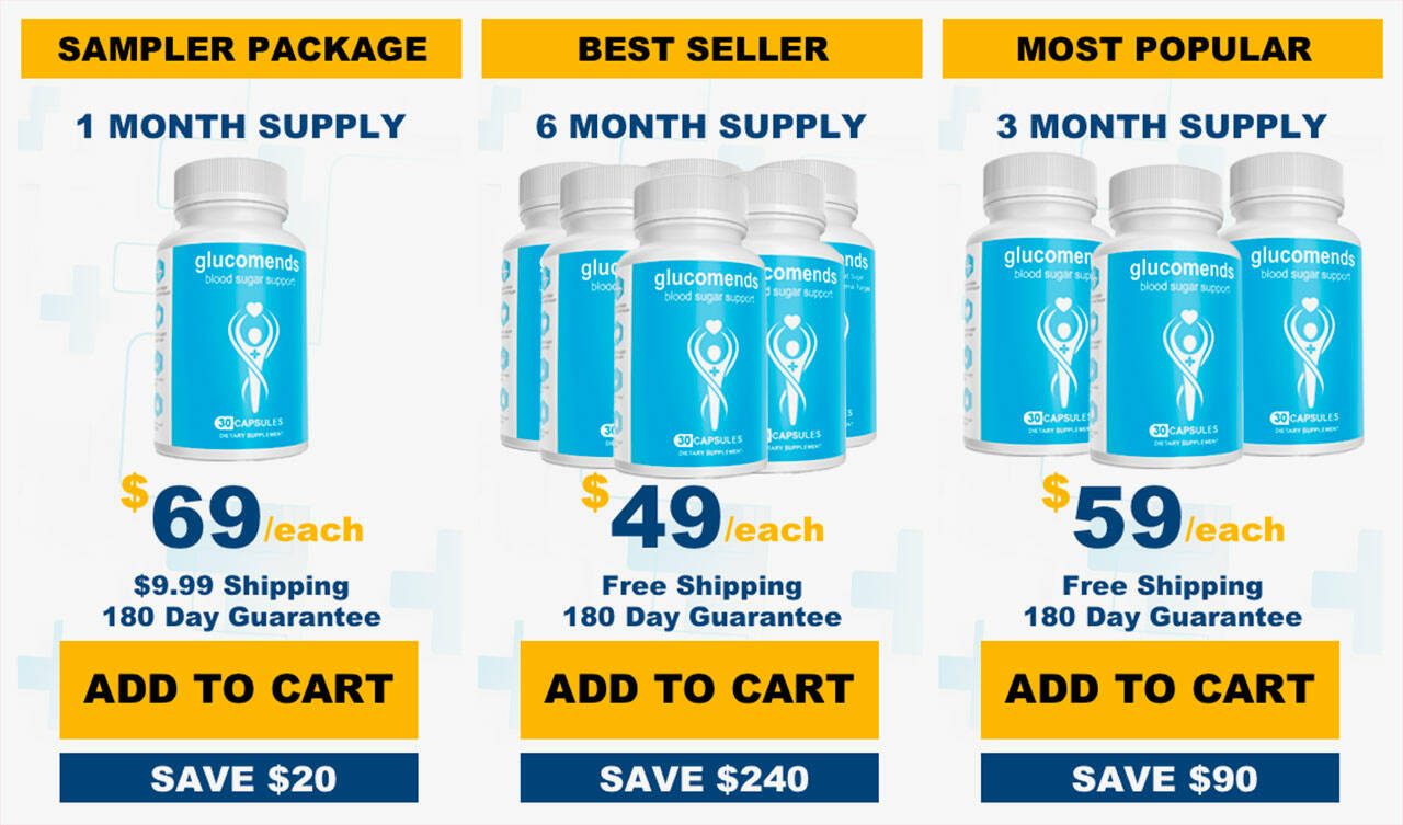 - Most Popular Package: The 3-month supply of Glucomends is selling at $59 per bottle + free shipping, saving consumers $90