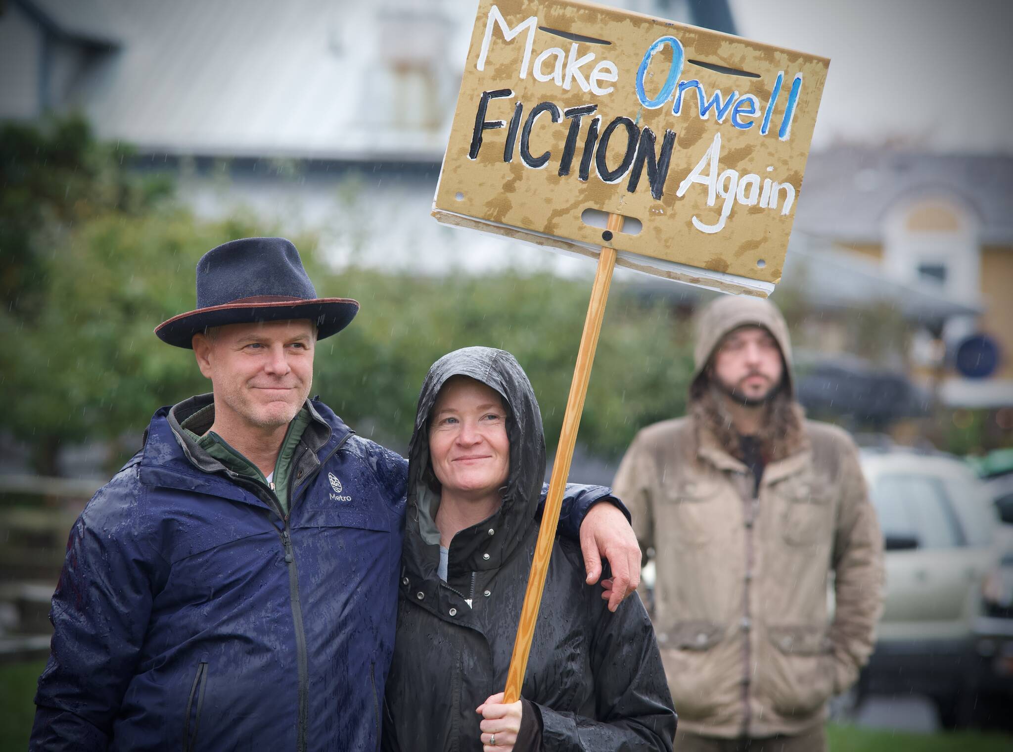 Despite steady rain, attendees arrived in colorful costumes, with some dressed as frogs and unicorns. Flags waved throughout the crowd as people assembled on the green. In a brief moment of youthful exuberance, an Orcas Island student climbed to the roof of the bathroom building, proudly waving a sign, before being quickly urged to come down safely.