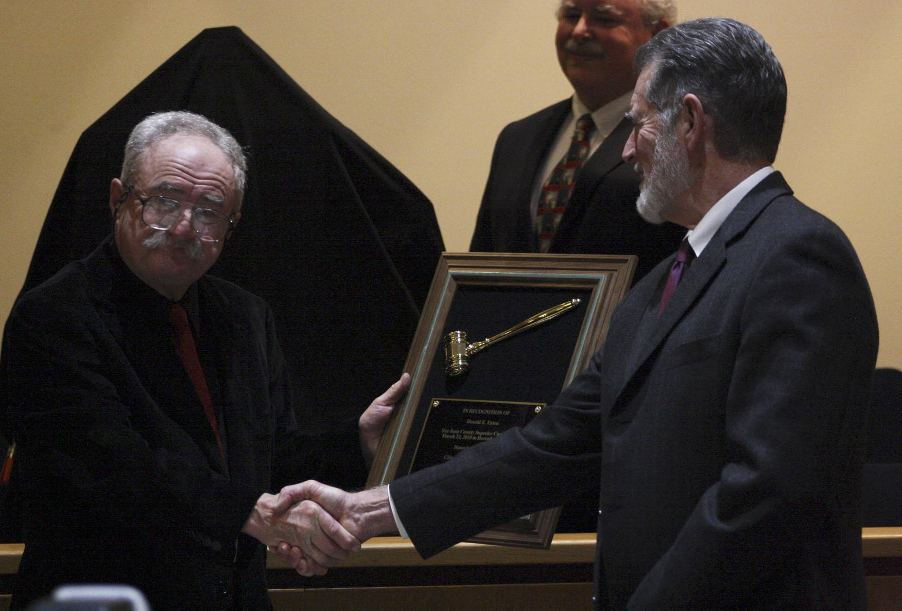 At his retirement party, Eaton was presented with a plaque and a painted portrait of himself on the bench by the San Juan County Bar Association. Barnaby Zall, a local attorney, said he used a photograph to create the painting in six weeks.