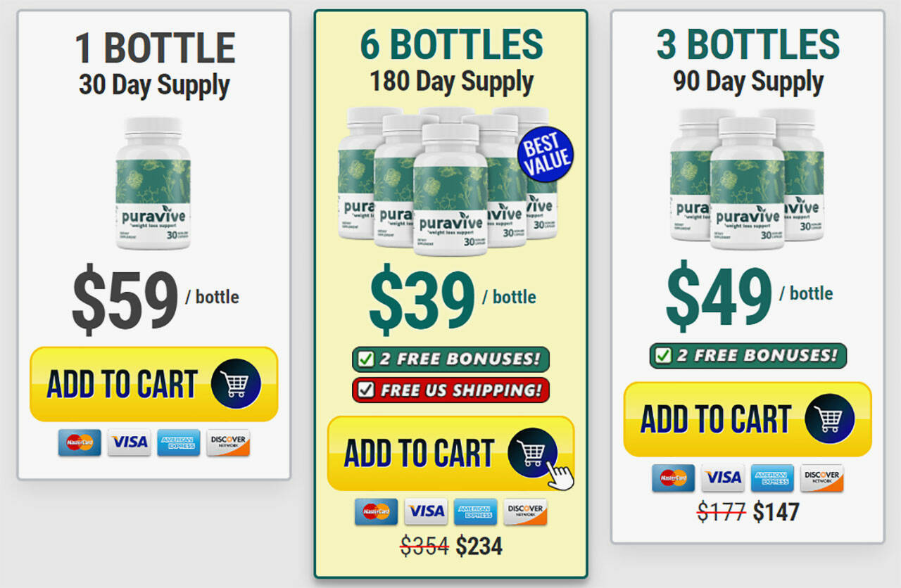 - Six Bottles: Gain the maximum value with six bottles of Puravive supplement for $234 with free shipping included. Additionally, this option comes with free bonuses to enhance your purchase.