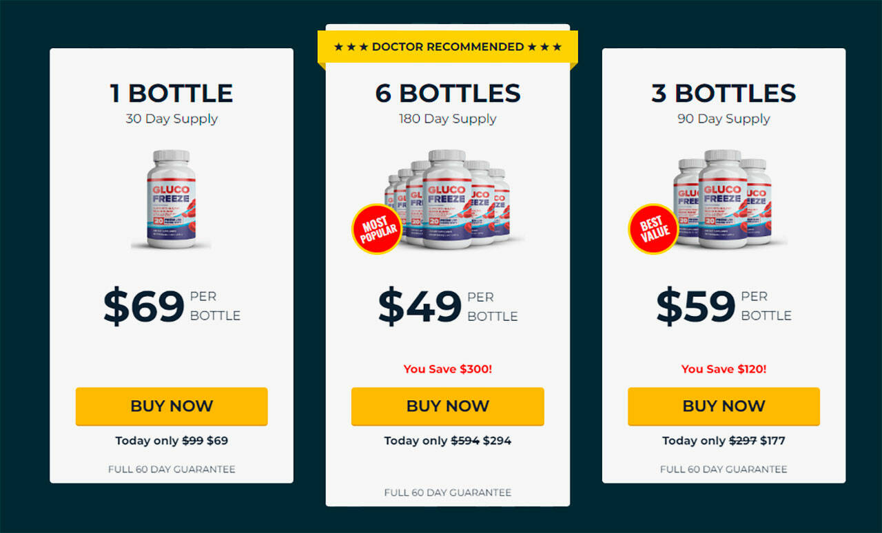 GlucoFreeze is a natural, safe supplement that freezes high blood sugar levels right in their tracks, allowing you to enjoy a healthy, youthful body full of energy. The supplement is exclusively available on the official website and comes in different packages. Here they are;