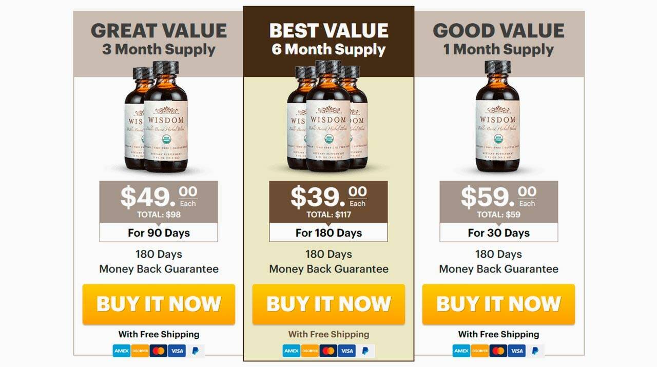 Wisdom is marketed as a dietary supplement due to its high nutrient content and other plant and herbal nutrients. This product was designed to help as many people as possible. As a result, Wisdom was reasonably priced. Wisdom is only available for purchase from the official website to maintain high-quality standards while keeping prices low. The current prices are: