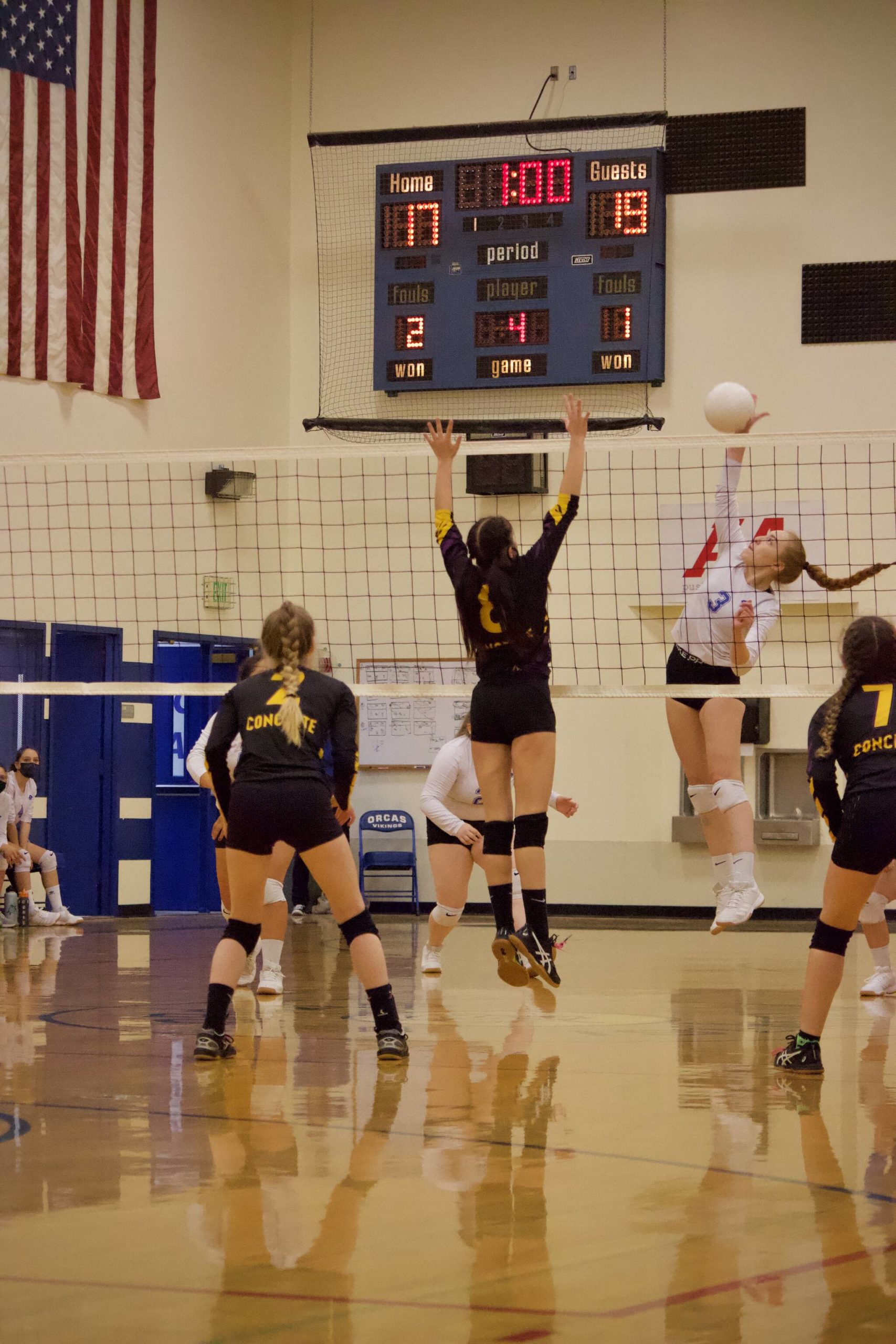 Despite a slow start to the match with Orcas losing the first set to Concrete, the Lady Vikings volleyball team solidly defeated the Concrete Lions in four sets.