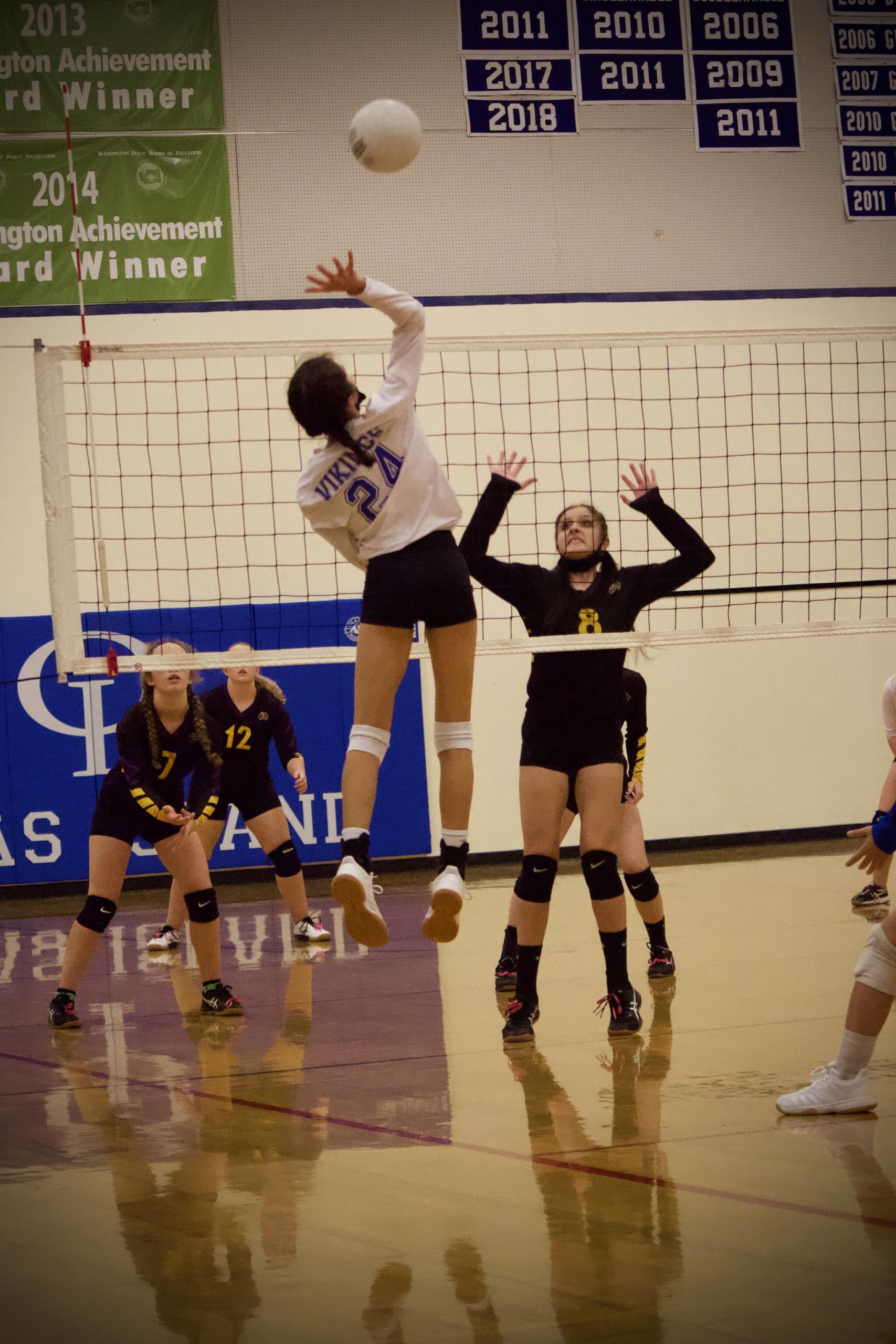 In the first set, it appeared that the Vikings had underestimated the quality of the Lions. After the lost set, Coach Rachel Wilson raised the energy in the huddle and returned focus to performing the caliber of play that they expect from themselves, no matter who the opponent. Orcas handily won the next two sets.