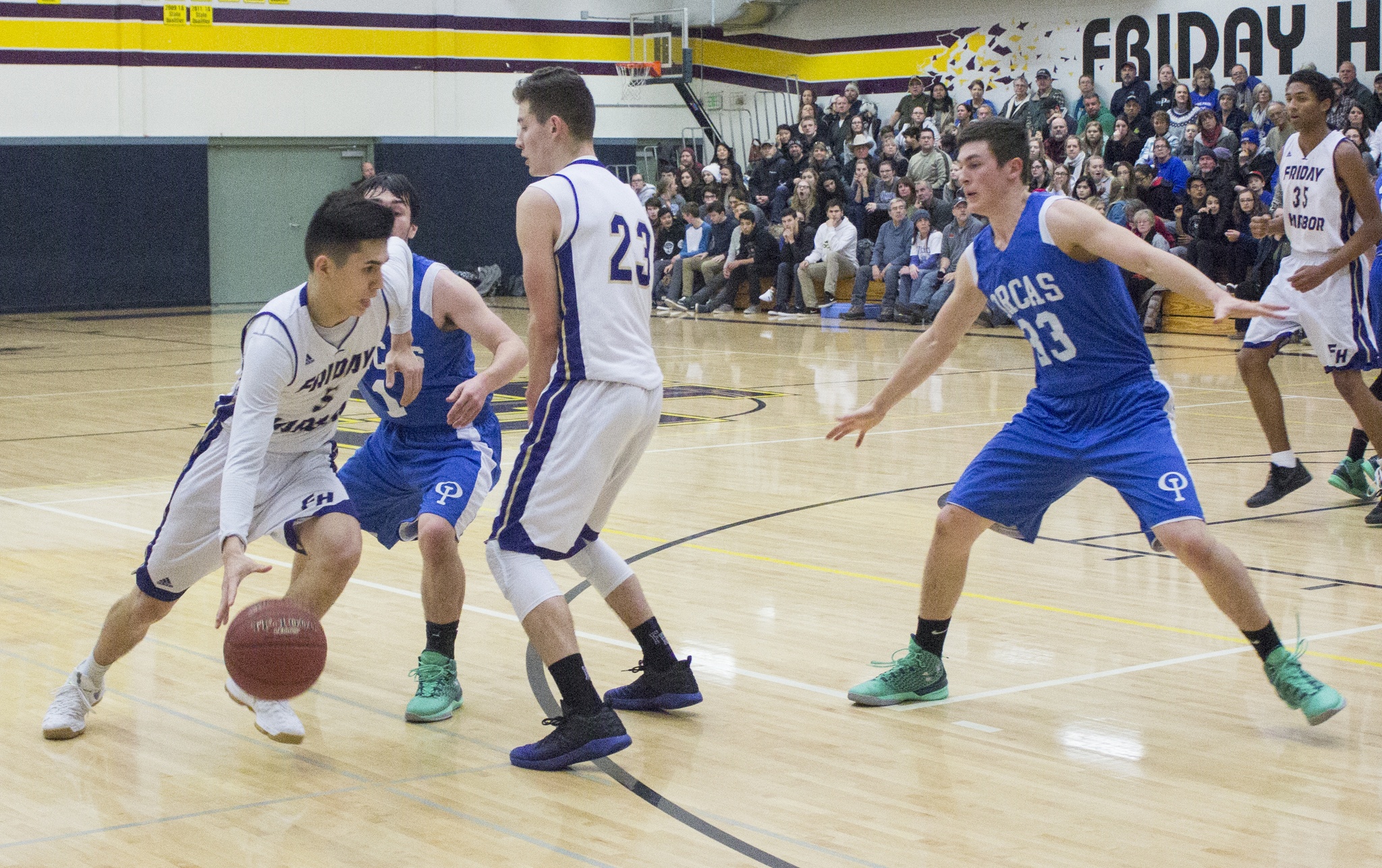 “We talked about the rivalry,” he said. “Two of my coaches, Amber Minnis and Sada Ashcraft, played in this rivalry, and they talked to the girls about how special it is and how they are now a part of this. It was great to see the girls pick up on the importance of this game. This will always be remembered. Katy Minnis led with 18 points – that was huge for us. We switched our team defense and that really messed with Friday Harbor. We still had to deal with their press, they are quick and we had to keep the ball from getting inside to their dominate player, who typically scores a lot. We held her to 4 points. This was a fun win. Hansen had 11 points, Maia Lewis-Shunk and Nichols had 4 each, Journey Howden and Rost both had 3 and Birdie Greening had 2. I was really surprised how many Orcas fans were here and the girls picked up on all that support. When we play them again it will be tough.”