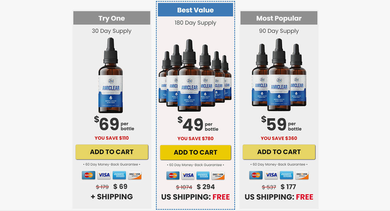 AmiClear is available at various pricing options designed to accommodate different budgets and health goals. Each package comes with a 60-day money-back guarantee, providing customers with peace of mind when trying the product.